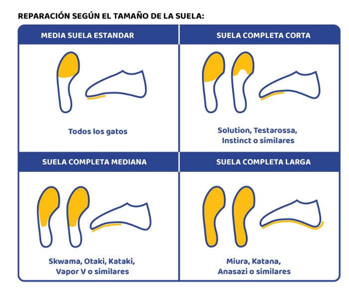 - Media suela: es la reparación estrella. Se puede aplicar a todos aquellos gatos que se encuentren fabricados con una suela completa y en los que sólo queremos reparar la parte delantera del gato o zona de pisada.